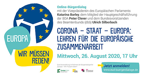 Welche Lehren können wir aus der Corona-Krise für die europäische Zusammenarbeit ziehen? Und vor welchen Herausforderungen steht das gemeinsame Europa abseits von Corona? Diese und viele weitere Fragen der Teilnehmenden standen im Mittelpunkt des Online-Bürgerdialogs am 26. August. Dafür standen die Europaabgeordnete und Vizepräsidentin des Europäischen Parlaments Katarina Barley, Peter Clever, Mitglied der Hauptgeschäftsführung der Bundesvereinigung der Deutschen Arbeitgeberverbände, und der Bundesvorsitzende des dbb beamtenbund und…