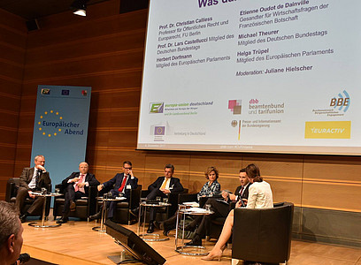 Der 27. Europäische Abend findet am 4. Dezember um 18.30 Uhr im dbb Forum in Berlin statt. Auf Einladung der Europa-Union Deutschland und des dbb beamtenbund und tarifunion diskutieren die Europaparlamentarier Helga Trüpel und Herbert Dorfmann mit den Bundestagsabgeordneten Michael Theurer und Prof. Dr. Lars Castellucci sowie dem Rechtswissenschaftler Prof. Dr. Christian Calliess über den Wert europäischer Solidarität. Den Impulsvortrag hält Günther Oettinger, EU-Kommissar für Haushalt und Personal.